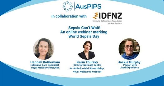 To mark World Sepsis Day, AusPIPS together with the Immune Deficiencies Foundation of New Zealand held an informative seminar about Sepsis, a life-threatening infection that patients with primary immunodeficiency are at higher risk of developing. The webinar covered what Sepsis is, why primary immunodeficient patients are more at risk, signs and symptoms, treatments and prevention strategies with expert speakers Professor Karin (Kas) Thursky and Hannah Rotherham, with a lived experience account of Sepsis from our President, Jackie.
